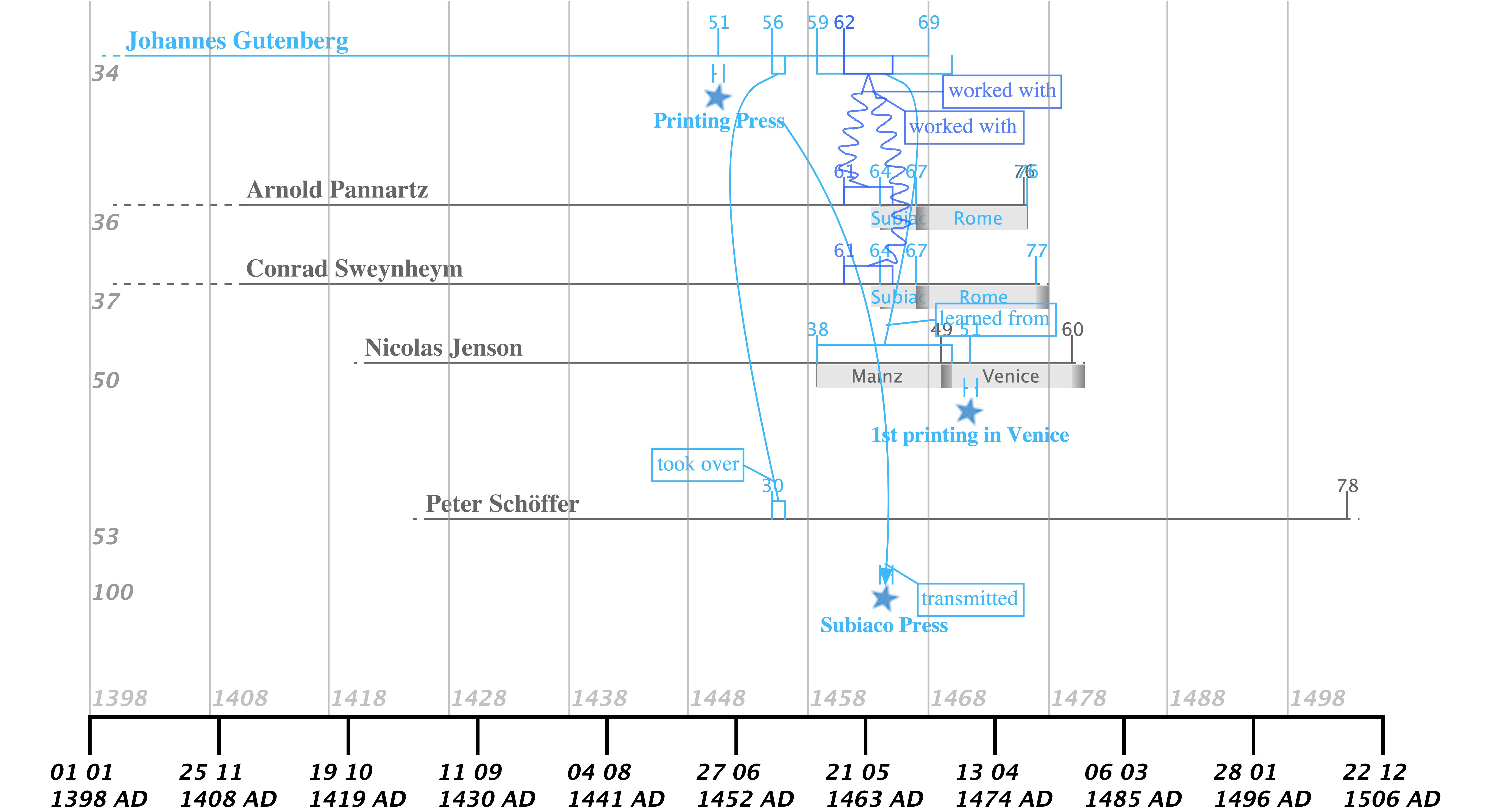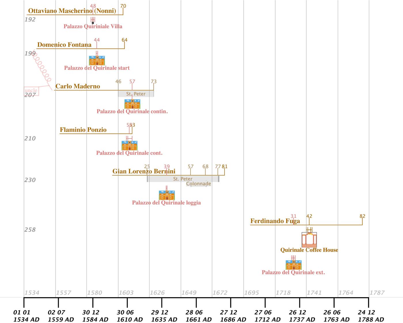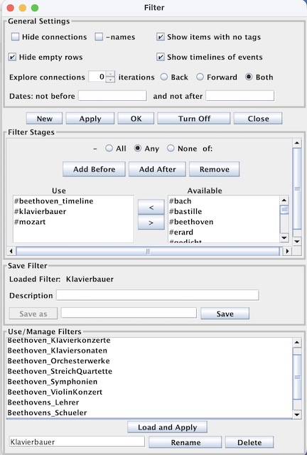 The examples show exported graphics which can be used in documents or presentations, a view of the filter window and a link to a full HTML export of several timeline files.This show an exported graphic of how the printing press was transmitted from Germany to Italy. Pannartz and Sweynheim worked with Gutenberg and went to Subiaco and then Rome. Jenson learned from Gutenberg in Mainz and went to Venice. Gutenberg's press was taken over by Schöffer. This example (in German) show when Beethoven received various pianos and from whom. It also shows the makers and their relationships with one section for the German, Austrian and French makers and another section for the English makers. This shows the architects who worked on the Palazzo Quirinale in Rome. For Maderno and Bernini the times when they worked on St. Peter's Basilica are also shown. The Filter window has some globally applicable checkboxes to hide all the connections, or just hide their names, to show all items that have no tags, to hide empty rows and to automatically include the timelines of events selected by the filter.