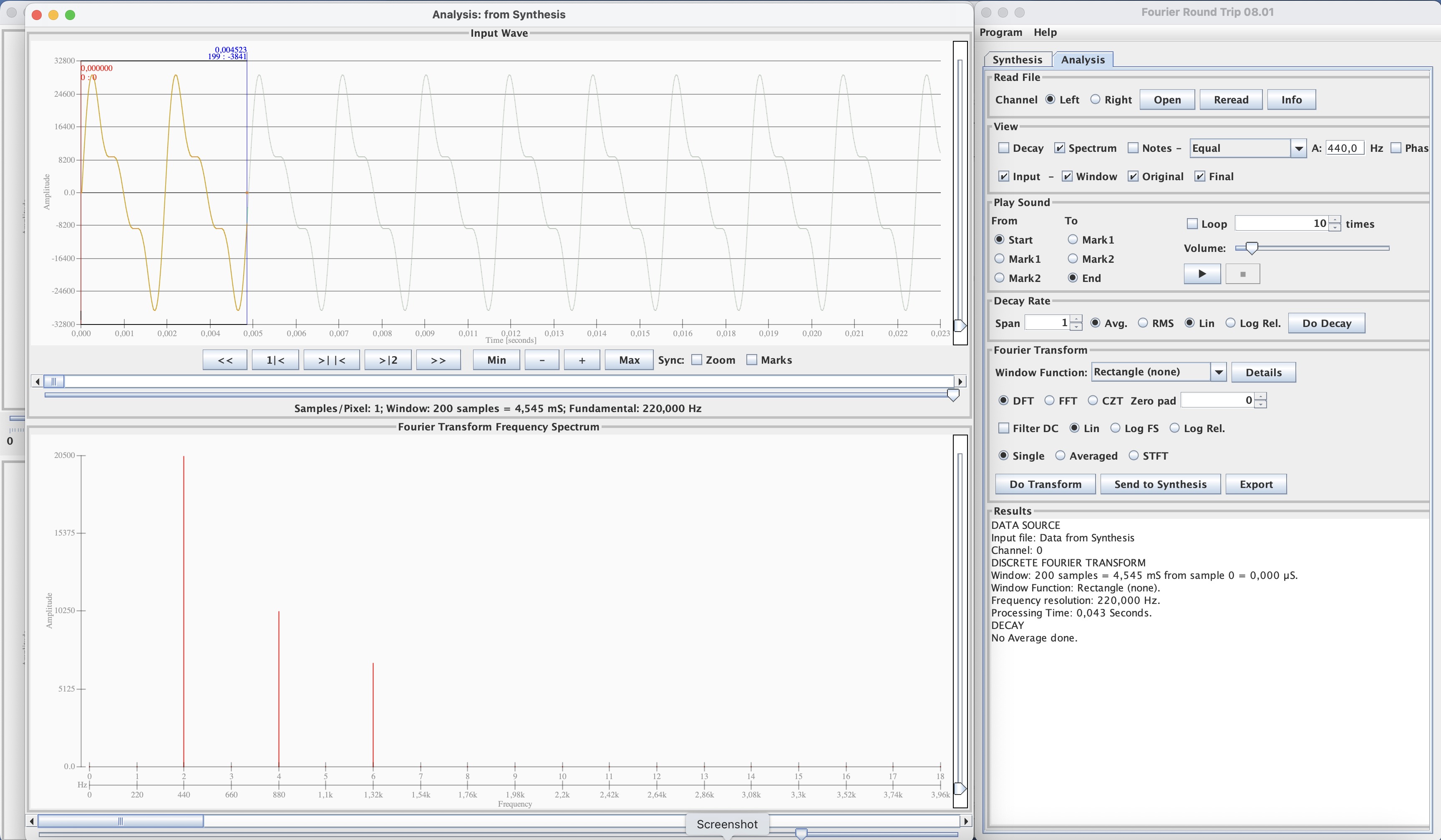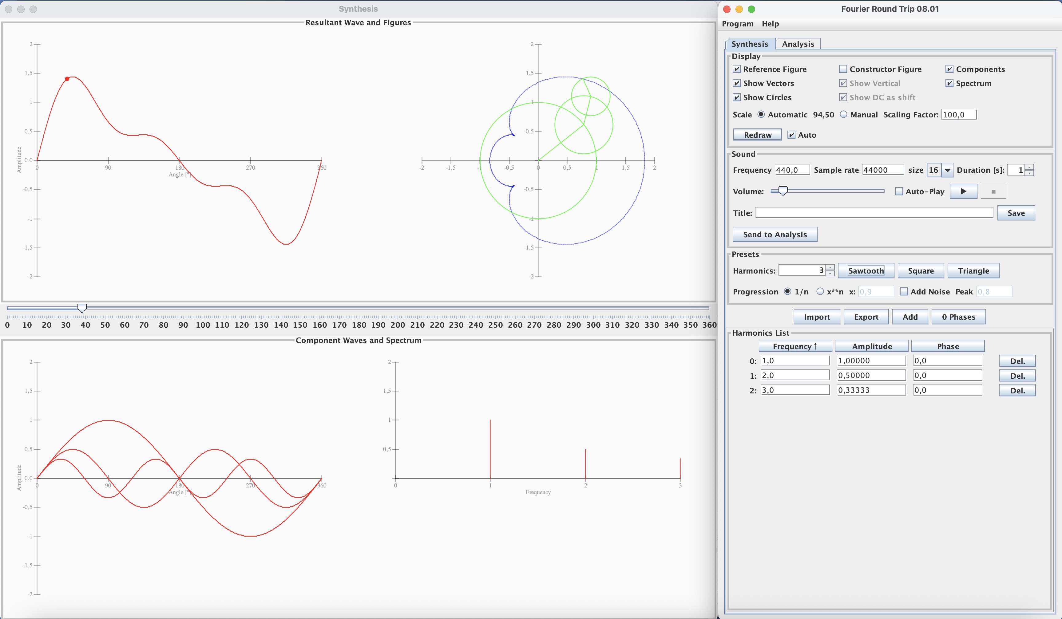 The Fourier Round Trip program is intended for exploring wave forms produced by harmonics or overtones, for example the sound waves produced by musical instruments, or any other type of wave.It has two main functions, synthesis and analysis.